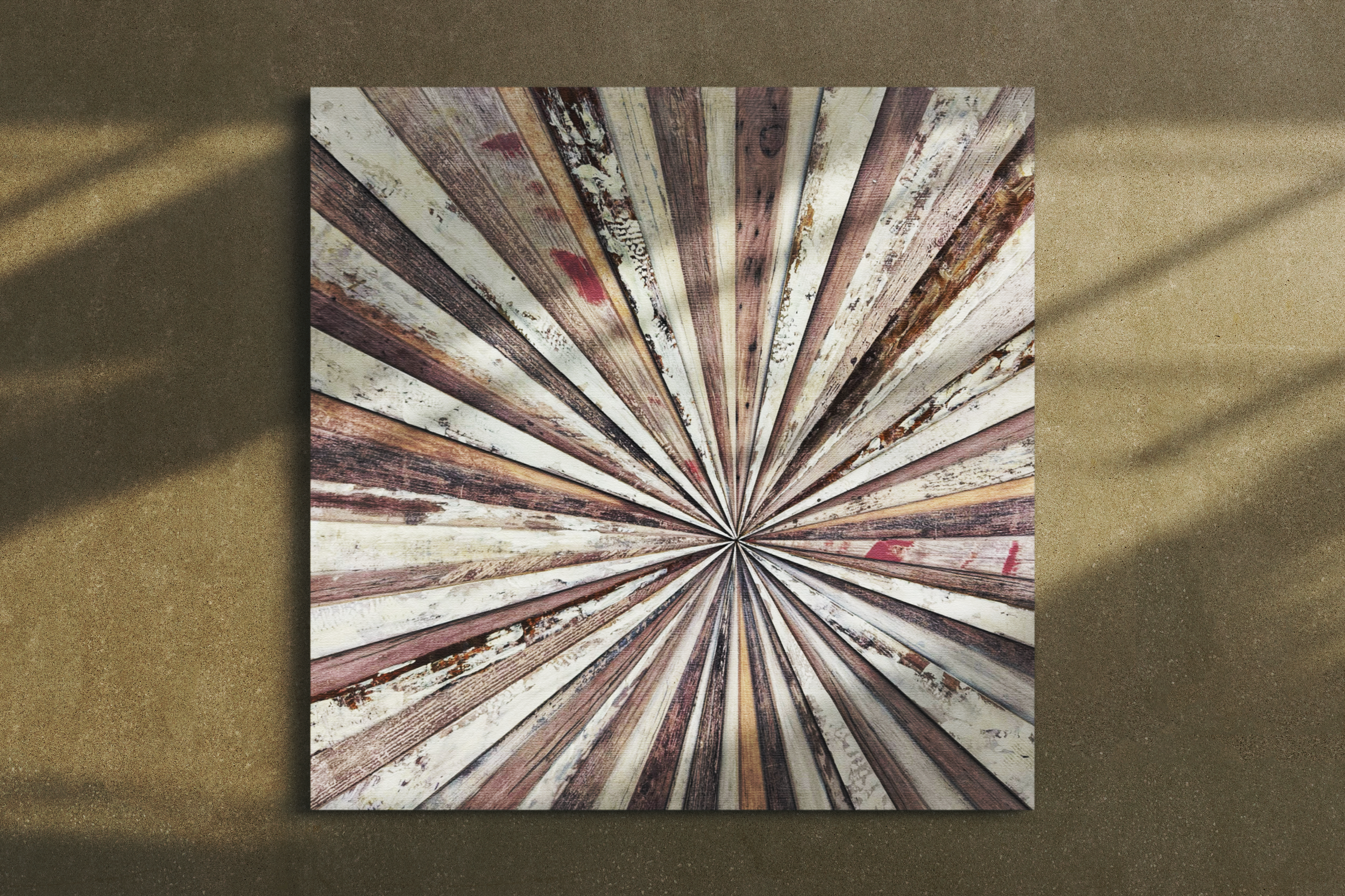 Make a bold statement with Radiant Timber, a handcrafted wood wall art piece by Jusbart. Measuring 40x40 inches, this square-format design features a stunning sunburst composition made from layered, textured wood strips—each cut and arranged by hand. Natural tones, distressed finishes, and a geometric center point create depth and movement, making it the perfect centerpiece for modern, rustic, or industrial interiors.
